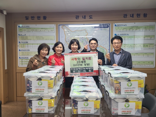 [뉴스스텝] 한국장애인녹색재단 경산지회(지회장 최성준)는 15일 북부동행정복지센터를 방문하여 관내 저소득층 20가구에 사랑의 밀키트(60만원 상당)를 기탁했다.