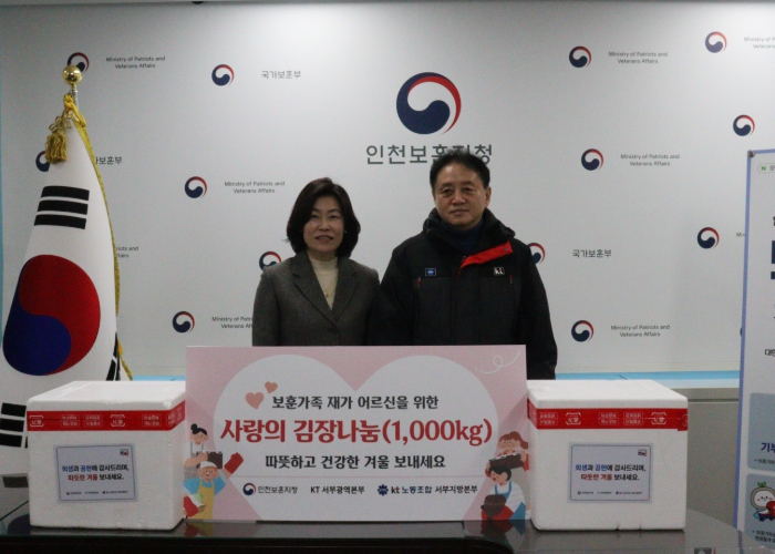 [뉴스스텝] 국가보훈부 인천보훈지청은 12월 3일 KT서부광역본부 후원으로 관내 거주 저소득 보훈 가족 100가구에 김장김치 1000kg을 전달했다.