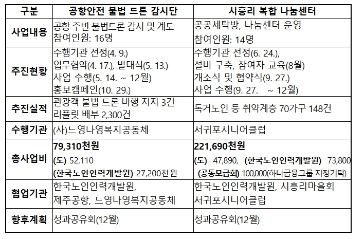 올해는 ㈔느영나영복지공동체, 한국공항공사 제주지역본부와 협력해 공항 주변 드론 비행금지 구역을 순찰·계도하는 ‘공항안전 불법드론 감시단’을 운영했다. 이 사업은 보건복지부 주관 ‘2026년 전국확산 모델 아이템’으로 선정되는 성과를 거뒀다.