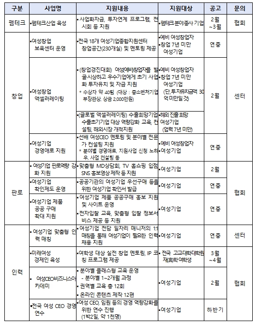올해 여성기업 육성사업은 여성 창업, 여성기업 판로, 인력 지원과 함께 인공지능‧바이오 등 첨단기술을 활용하여 여성의 건강 및 삶의 질을 제고하는 펨테크(FemTech) 산업 육성을 포함한 4개 분야, 11개 세부사업으로 구성되며 총 지원 규모는 총 117.4억원이다.