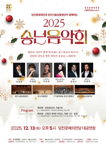 당진문화재단 관계자는 “이번 송년음악회는 시민이 주체가 되어 함께 만드는 무대라는 점에서 더욱 뜻깊다”며 “베토벤의 음악을 통해 한 해를 마무리하고, 새해의 희망과 감동을 함께 나누는 시간이 되길 바란다”고 전했다.
