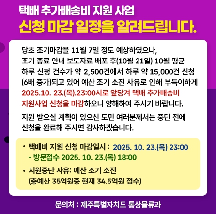 [뉴스스텝] 제주특별자치도는 택배 추가배송비 지원 사업이 당초 11월 7일 종료 예정이었으나, 신청 급증으로 10월 23일 오후 11시(방문 접수 오후 6시)에 조기 종료된다고 밝혔다.