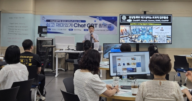 이날 교육은 울산대학교 교수학습개발센터 허정필 연구교수를 강사로 초청해 실무에 바로 적용할 수 있는 AI 활용 역량 강화에 초점을 맞췄다. 특히 챗지피티의 기본적인 사용법부터 보고서 작성과 홍보물 기획, 프로그램 기획서 작성 등 현장 중심의 실습 교육으로 구성돼 큰 호응을 얻었다.