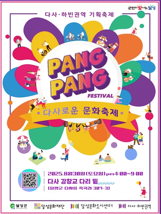[뉴스스텝] (재)달성문화재단 달성문화도시센터(이사장 최재훈)가 오는 8월 30일 오후 4시부터 9시까지 강창교 하부 공간 일원에서 ‘팡팡 다사로운 문화 축제’를 개최한다.