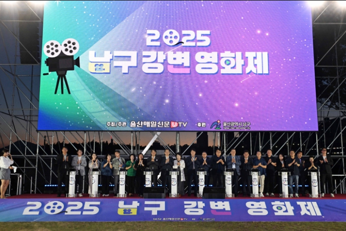 [뉴스스텝] 29일 서동욱 남구청장, 이상기 남구의회의장이 태화강 1둔치에서 열린 2025 남구 강변영화제 개막식에 참석하여 내빈과 함께 터치버튼을 누르며 개막을 축하하는 포퍼먼스를 하고 있다.