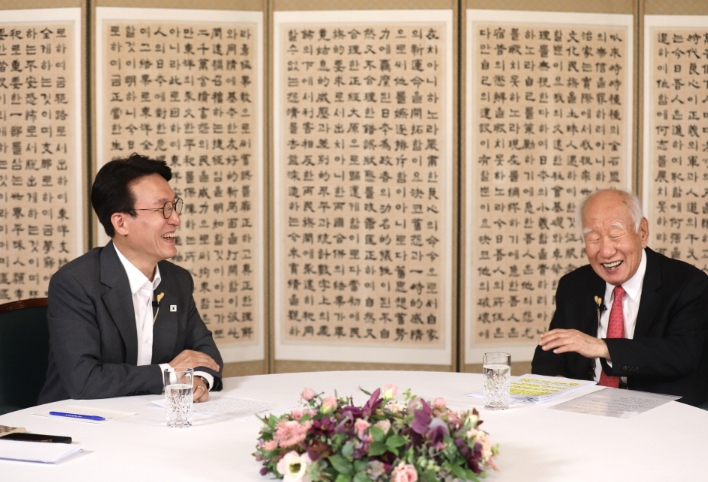 ▲ 김민석 국무총리가 31일 삼청동 총리서울공관에서 열린 K-토론나라 '촐이의 인터뷰'에서 신동식 한국해사기술회장과 대한민국 조선 산업 관련 토론을 하고 있다.(국무조정실) |