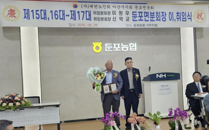 이모완 둔포면장은 “이번 이·취임식은 세대 간 존중과 지역 공동체의 연대를 다시 확인하는 뜻깊은 자리”라며 “행정에서도 어르신들의 목소리에 귀 기울이며 필요한 지원을 아끼지 않겠다”고 말했다.