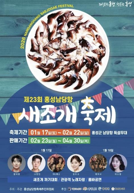 김용태 축제추진위원장은 “올해는 새조개 작황이 좋아 남당항 새조개의 진정한 맛을 즐길 수 있는 축제가 될 것”이라며, “관광객들이 다시 찾고 싶은 축제가 되도록 준비에 만전을 기하고 있다”고 말했다.