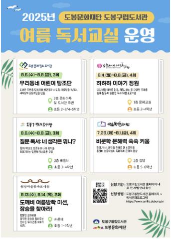 [뉴스스텝] 서울 도봉구가 구립도서관 5개관에서 ‘2025년 여름 독서교실’을 운영한다고 밝혔다.