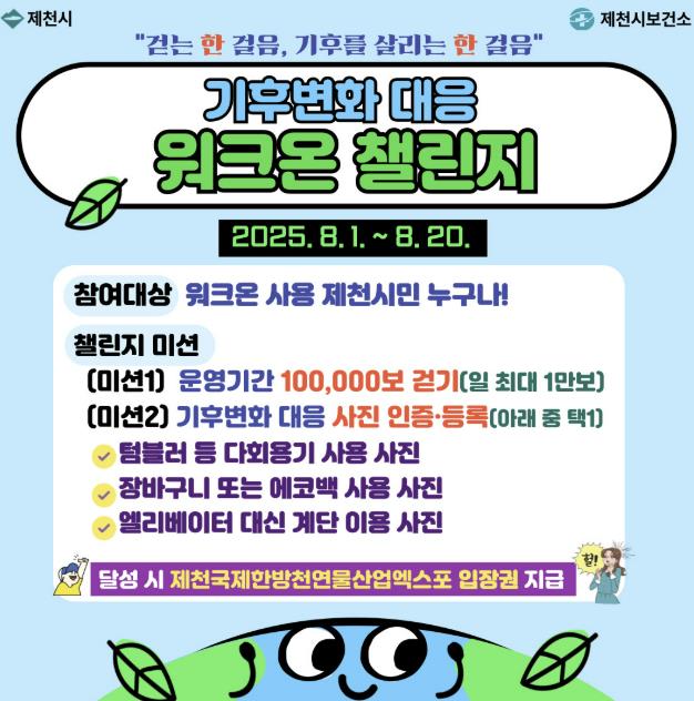 참여 신청은 8월 1일까지이며, 제천시민이면 누구나 워크온 앱을 통해 참여할 수 있다.