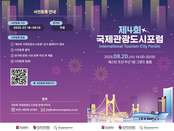 [뉴스스텝] 부산시는 20일 오후 2시 웨스틴 조선 부산(1층 그랜드 볼룸)에서 '제4회 국제관광도시 포럼'을 개최한다고 밝혔다.
