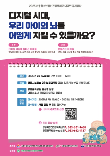 [뉴스스텝] 강릉시는 오는 16일 오전 10시부터 12시까지 강릉시보건소 2층 보건교육장에서 ‘디지털 시대, 우리 아이의 뇌를 어떻게 지킬 수 있을까요?’라는 주제로 아동‧청소년 공개강좌를 개최한다.