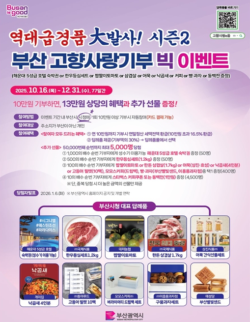 [뉴스스텝] 부산시는 지난 10월 16일부터 진행 중인 '역대급 경품 대발사 시즌2! 부산 고향사랑기부제 연말 빅 이벤트'에 많은 동참을 당부했다.