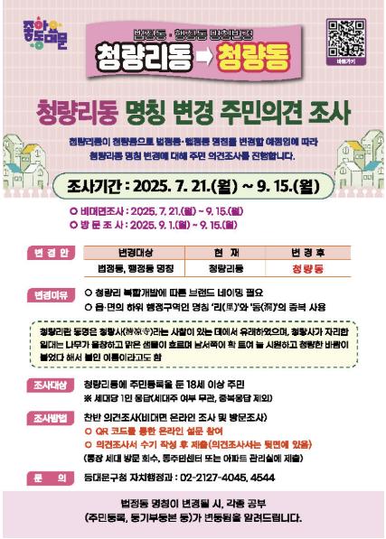이번 조사는 청량리 복합개발로 인해 변화된 지역 현실을 반영하여 동 명칭을 보다 간결하고 상징성 있는 ‘청량동’으로 변경하자는 주민들의 지속적인 요청에 따라 추진되는 것이다.