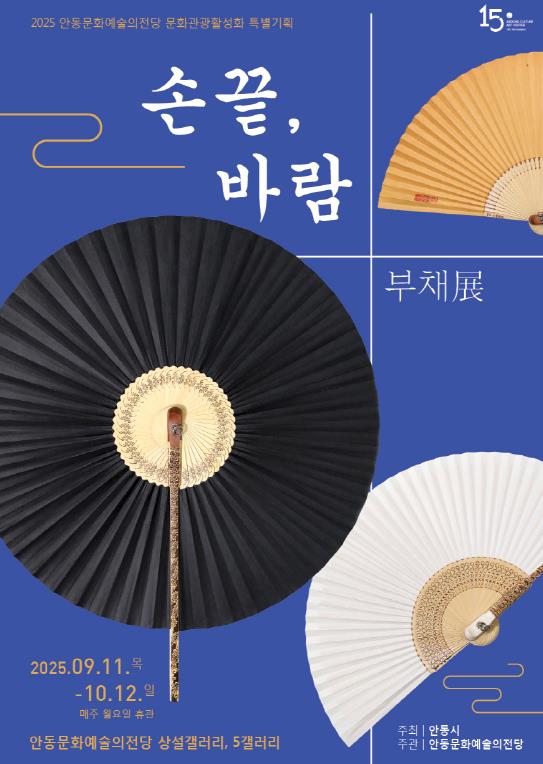 [뉴스스텝] 안동문화예술의전당은 한국 전통 공예의 아름다움을 담은 부채를 주제로 한 특별전 '손끝, 바람-부채展'을 2025년 9월 11일부터 10월 12일까지 상설갤러리와 5갤러리에서 개최한다. 이번 전시는 안동국제탈춤페스티벌 기간과 맞물려 관람객들에게 더욱 특별한 문화체험을 제공한다.