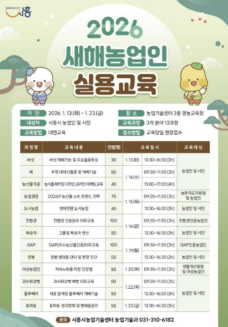 [뉴스스텝] 시흥시는 농업인의 전문역량 강화와 안정적인 영농 활동을 지원하기 위해 ‘2026년 새해농업인 실용교육’을 오는 1월 13일부터 23일까지 시흥시농업기술센터 3층 영농교육장에서 운영한다.