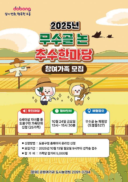 [뉴스스텝] 서울 도봉구가 오는 10월 24일 무수골 친환경 논 체험장(도봉동 527)에서 ‘무수골 논 추수한마당’ 행사를 개최한다.