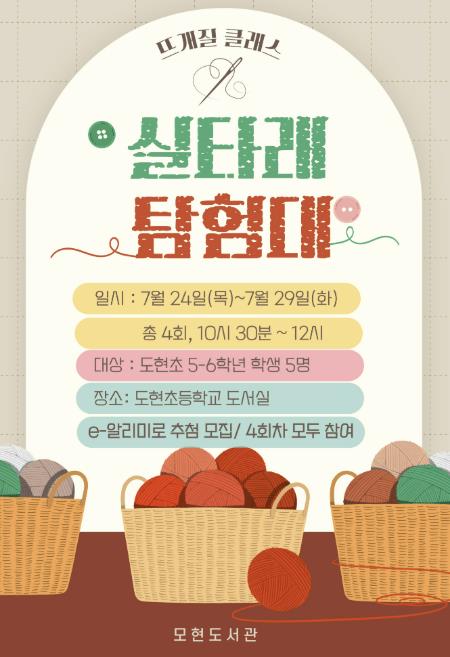 [뉴스스텝] 용인특례시는 모현도서관에서 7월 24일부터 29일까지 도현초등학교 5~6학년 학생을 대상으로 뜨개질 프로그램 ‘실타래 탐험대’를 운영한다고 21일 밝혔다.