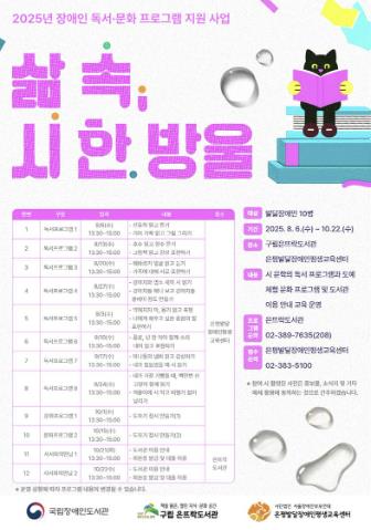 [뉴스스텝] 서울 은평구는 국립장애인도서관 주최의 ‘2025년 장애인 독서·문화 프로그램 지원사업’에 구립 은뜨락도서관이 선정돼 발달장애인 대상 ‘삶 속, 시 한 방울’ 프로그램을 운영한다고 밝혔다.