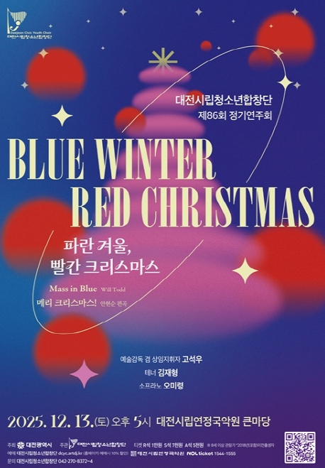 [뉴스스텝] 대전시립청소년합창단이 13일 오후 5시, 대전시립연정국악원 큰마당에서 제86회 정기연주회‘파란 겨울 빨간 크리스마스’(Blue Winter Red Christmas)를 무대에 올린다.
