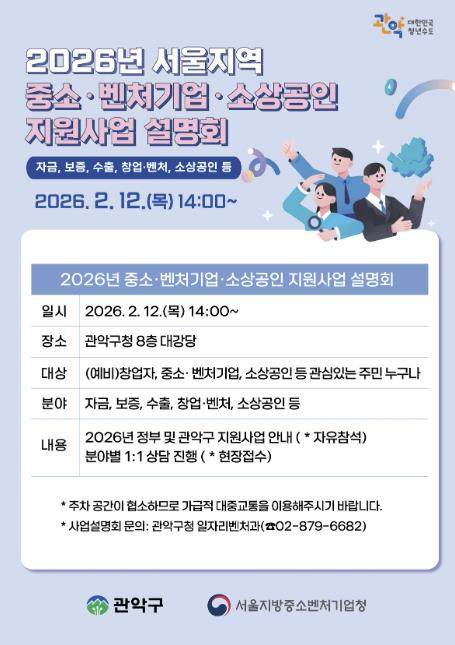 [뉴스스텝] 관악구가 지역 경제의 주축인 중소·벤처기업과 소상공인의 경영 안정을 돕고, 혁신 성장의 발판을 마련하기 위한 대규모 정책 소통의 장인 오는 12일(목) 14시 관악구청 8층 대강당에서 ‘2026년 중소벤처기업·소상공인 지원사업 설명회’를 개최한다.