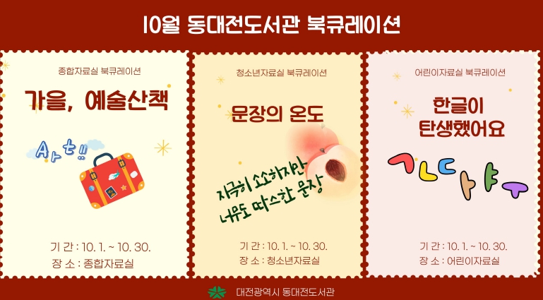 [뉴스스텝] 동대전도서관은 가을 독서의 계절을 맞아 10월 한 달간 연령별 맞춤 주제 북큐레이션 전시를 운영한다고 10일 밝혔다.