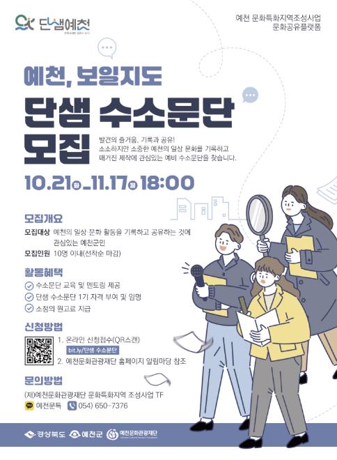 ‘예천, 보일지도’의 ‘단샘 수소문단’은 예천 군민이 지역 문화의 능동적인 기록 주체로 성장하도록 역량을 강화하고, 향후 예천 문화를 담는 매거진을 제작할 인력을 양성하는 것을 목표로 한다.