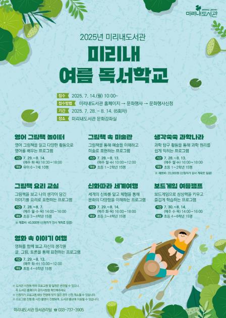 [뉴스스텝] 원주시 미리내도서관은 7월 여름방학을 맞아 유아와 초등학생을 위한 ‘여름 독서학교’ 및 ‘방학 특별 프로그램’을 운영한다.