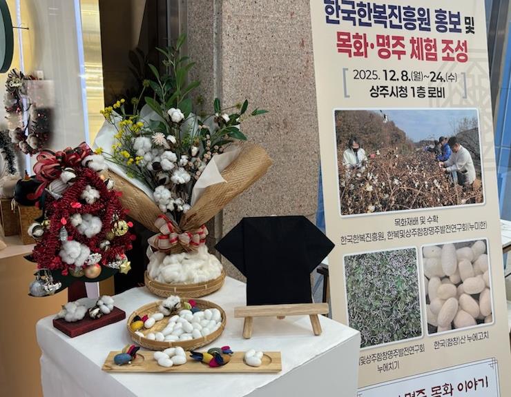 [뉴스스텝] 한국한복진흥원 입주기업 누미한은 12월 8일부터 12월 24일까지 진흥원 내 목화밭에서 재배한 목화솜과 명주천을 활용한 체험형 전시를 상주시청 로비에서 진행한다.