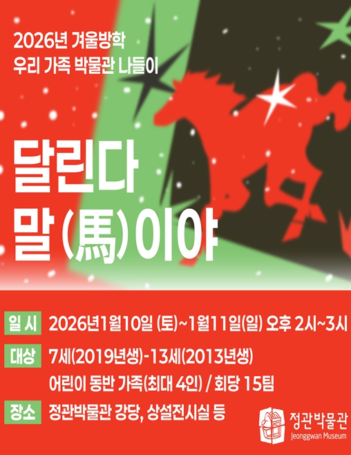 [뉴스스텝] 부산시립박물관 소속 정관박물관은 다가오는 2026년 병오년(丙午年) '붉은 말의 해'를 맞아, 내년 1월 10일부터 11일 양일간 겨울방학 가족 교육프로그램 '겨울방학 우리 가족 박물관 나들이-달린다 말(馬)이야'를 운영한다고 밝혔다.