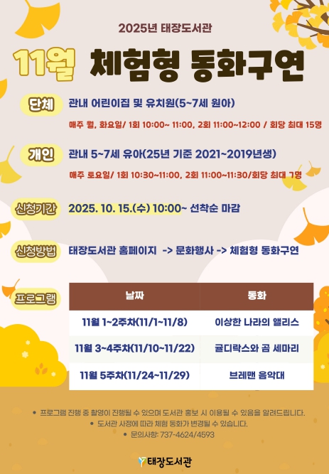 원주시 태장도서관, 11월 체험형 동화구연 운영