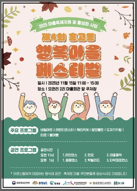 [뉴스스텝] 홍성군은 15일 오관2리 마을회관 주차장 일원(홍성읍 조양로143번길 35-12)에서 ‘제4회 홍고통 행복마을 페스티벌’을 개최한다고 밝혔다.