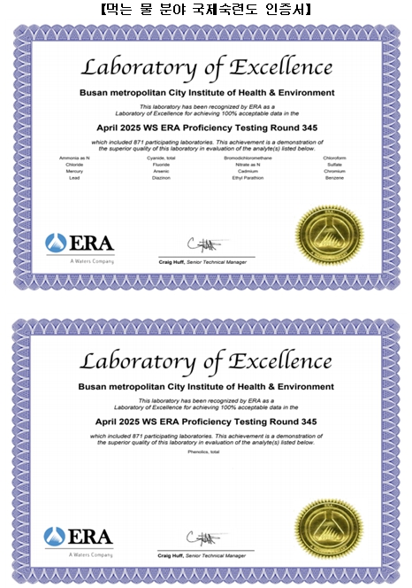 [뉴스스텝] 부산시 보건환경연구원은 먹는 물 분야 분석 능력 검증을 위해 참가한 미국 환경자원협회(ERA) 주관 국제숙련도 평가에서 전 항목 '만족' 판정을 받아 '최고 등급' 인증을 획득했다고 밝혔다.