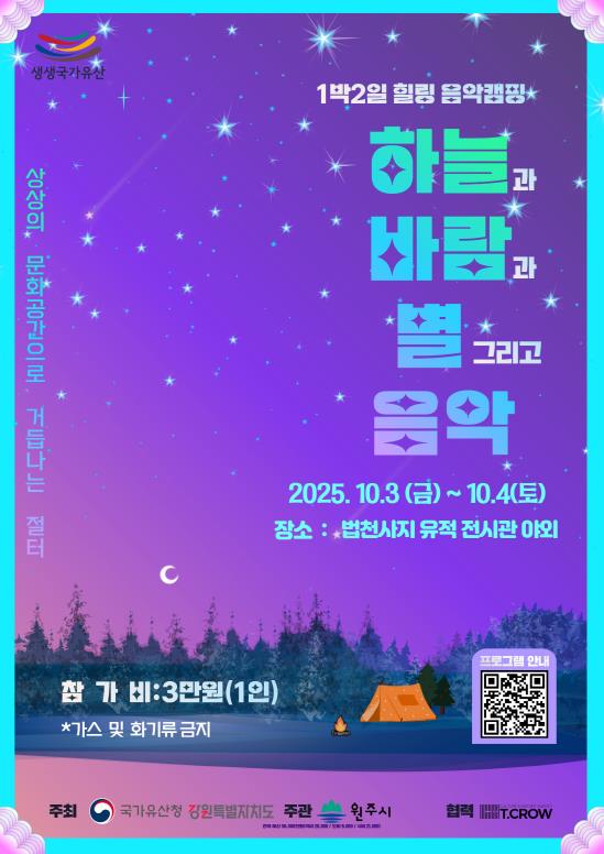 이 사업의 일환으로 추진되는 이번 힐링 음악캠프는 원주 대표 폐사지인 법천사지를 배경으로 교육 및 체험, 음악회 등 다양한 프로그램이 진행된다.