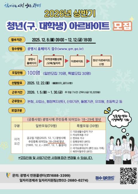 [뉴스스텝] 광명시는 오는 8일부터 12일까지 ‘2026년 상반기 청년 아르바이트’ 참여자 100명을 모집한다.