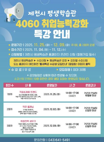 이번 틈새특강은 일반시민과 40대 이상 취업·재취업 준비자, 평생학습강사를 대상으로 진행되며, 세명대학교와 대원대학교 교수진 및 컨설팅 전문가들이 참여한다.