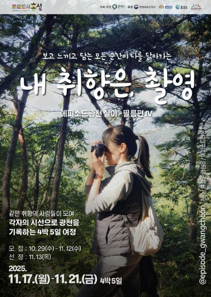 참여자 모집은 오는 12일까지이며, 신청은 인스타그램 프로필의 링크트리를 통해 가능하다. 선정 결과는 13일, 프로그램은 17일부터 21일까지 광천 일대에서 진행된다. 사진, 영상, 기록을 사랑하는 청년이라면 누구나 참여할 수 있다.