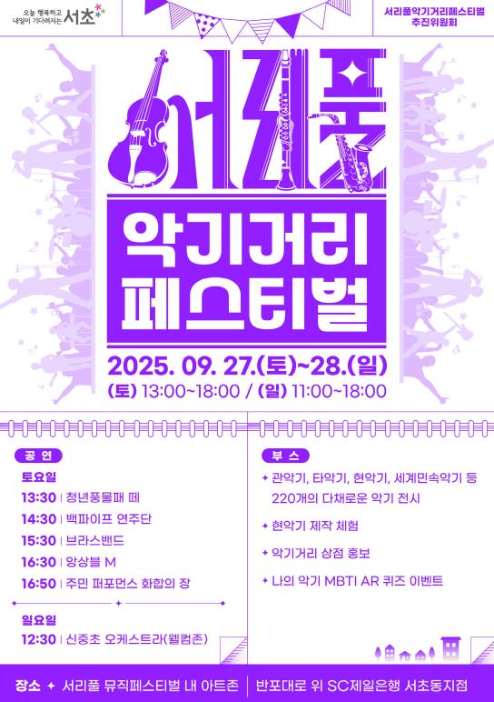 축제의 하이라이트인 공연 무대 역시 풍성하게 꾸며진다. 27일(토) 서리풀뮤직페스티벌 내 아트존에서 선보이는 서리풀 악기거리 축제 개막식에는 청년풍물패의 흥겨운 고창농악공연이 울려 퍼지고 한국 백파이프 연주단, 브라스밴드, 현악 5중주 앙상블 무대가 이어진다. 이후 주민, 연주자, 악기 상인들이 함께 참여하는 대규모 합주 퍼포먼스가 펼쳐져 모두가 주인공이 되는 화합의 장을 연출할 것으로 기대를 모은다. 마지막으로 28일(일) 웰컴존에서 예정된 신중초등학교 오케스트라 공연에서는 아이들이 클래식 명곡들을 연주하며 서리풀뮤직페스티벌의 감동을 이어나간다는 계획이다.