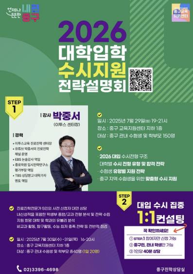 [뉴스스텝] 서울 중구가 관내 수험생과 학부모를 대상으로 2026학년도 대입 수시전형을 대비한 전략 설명회와 집중 일대일 컨설팅을 운영한다.