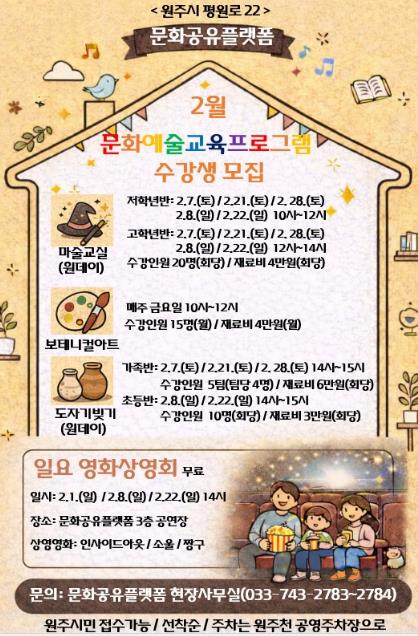 [뉴스스텝] 원주시 문화공유플랫폼이 2월 문화예술 교육프로그램 수강생을 모집한다.