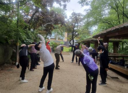 ▲ 도봉구 지역 주민들이 ‘힐링숲속캠프’에서 건강 체조를 하고 있다. |