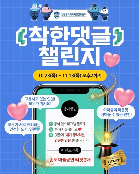 [뉴스스텝] 인천광역시는 시민과의 공감과 소통을 강화하고 생활 속 안전 문화를 확산하기 위해 인천광역시자치경찰위원회 공식 인스타그램 채널을 개설하고, 10월 23일부터 11월 13일 14:00까지 ‘내가 생각하는 안전한 인천, 한 줄 남기기’ 착한 댓글 챌린지를 진행한다고 밝혔다.