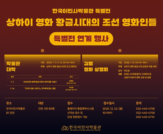 [뉴스스텝] 인천광역시 시립박물관 분관 한국이민사박물관은 특별전 〈상하이 영화 황금시대의 조선 영화인들〉과 연계해 유명 작가 초청 특강을 개최한다고 밝혔다.