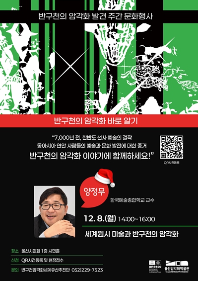 이번 강연에서는 세계 원시미술과 반구천의 암각화를 주제로 예술적·미술사적 가치를 시민들에게 쉽게 풀어내며, 암각화가 인류 보편의 예술적 표현임을 강조할 예정이다.
