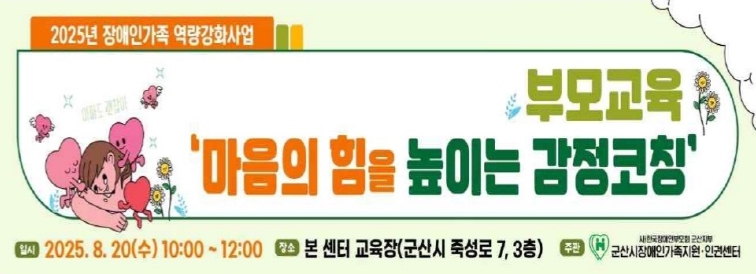 ‘마음의 힘을 높이는 감정코칭’은 군산시 장애인 부모 15명을 대상으로 8월 20일 군산시장애인가족지원인권센터 교육장에서 무료로 진행된다.