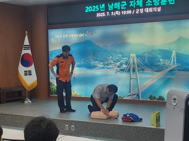 [뉴스스텝] 남해군은 지난 3일 대회의실에서 전 직원을 대상으로 2025년 자체 소방훈련을 실시했다고 밝혔다.