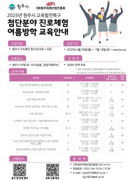 [뉴스스텝] 원주시는 2025년 교육발전특구 사업의 일환으로, (재)원주미래산업진흥원과 함께 여름방학 기간 지역 초·중·고등학생을 위한 ‘첨단분야 진로체험 교육 프로그램’을 전액 무료로 운영한다.