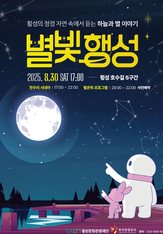 [뉴스스텝] 횡성문화관광재단은 지난 8월 2일 안흥찐빵모락모락마을에서 야간관광 활성화프로그램을 개최한데 이어, 오는 30일 오후 7시부터 횡성 호수길 일원에서‘별빛행성’,‘한우리시네마’ 프로그램을 개최한다고 전했다.