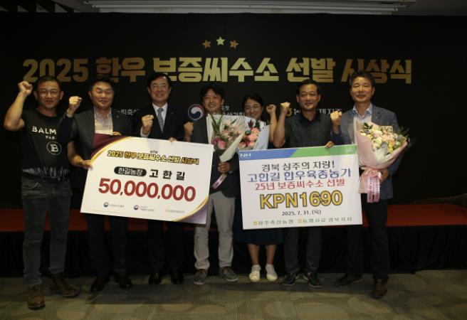 [뉴스스텝] 상주시 한길농장은 7월 31일 농협 안성팜랜드에서 개최된 2025년 한우 보증 씨수소 선발 시상식에서 농촌진흥청 가축개량협의회 유전능력평가 보증씨수소 “KPN 1690”으로 선발됐다.
