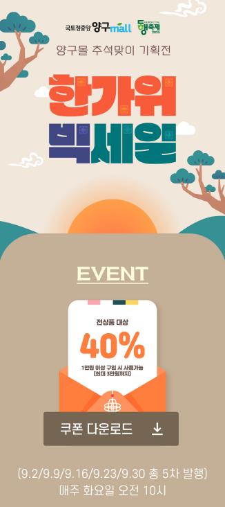 양구몰 회원은 행사 기간 중 매주 화요일 오전 10시에 전 상품 대상 40% 할인쿠폰을 받을 수 있다. 일자별로는 9월 16일, 9월 23일, 9월 30일에 쿠폰을 발급받을 수 있다. 단 할인쿠폰은 한정 수량 발급돼 조기 소진될 수 있다.